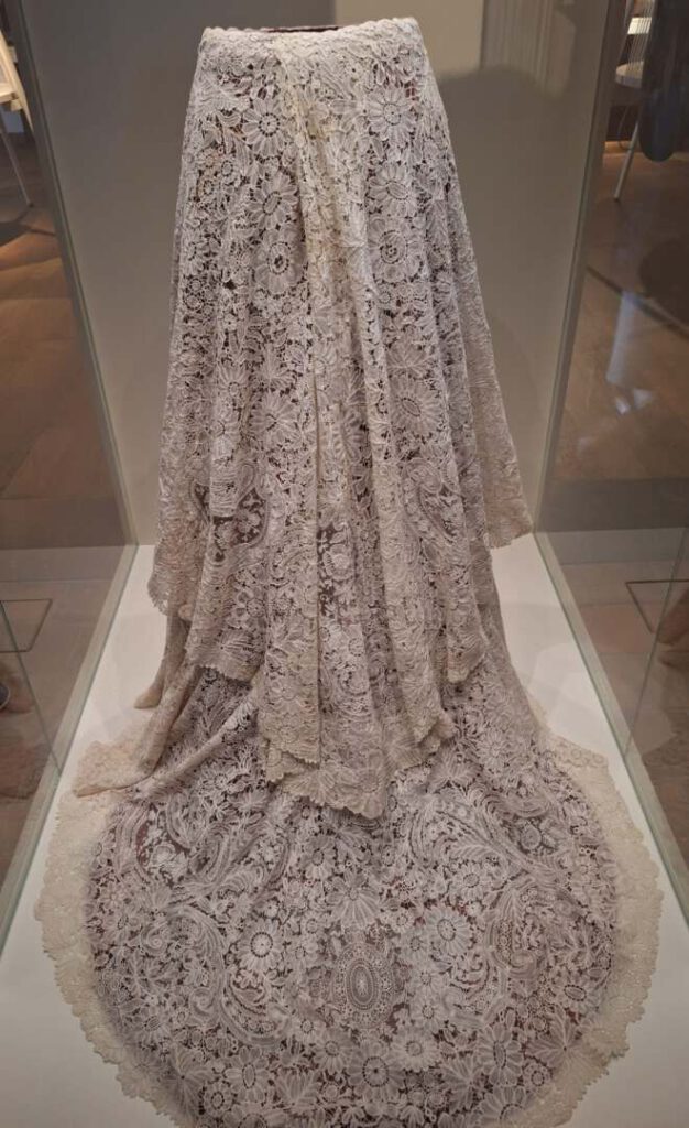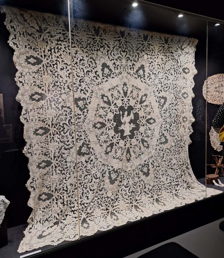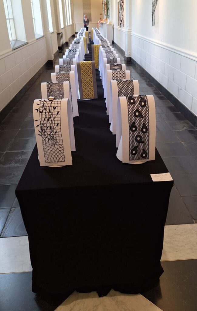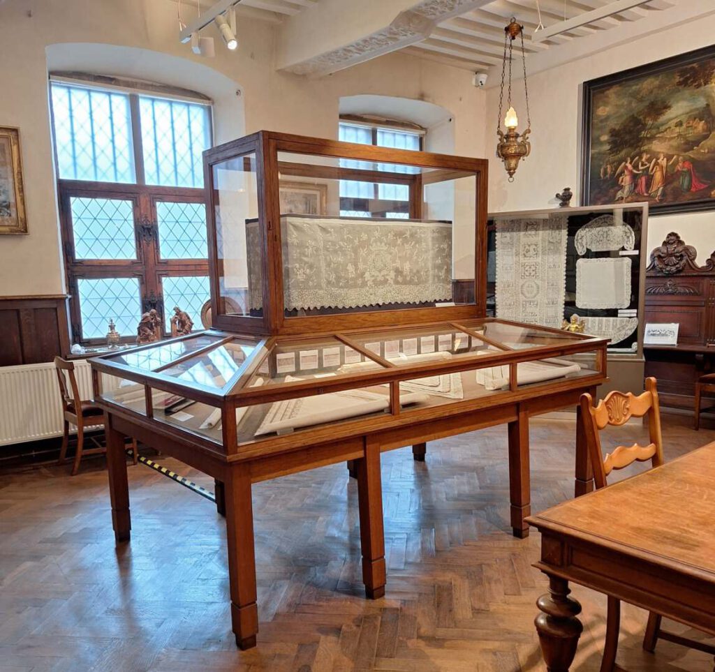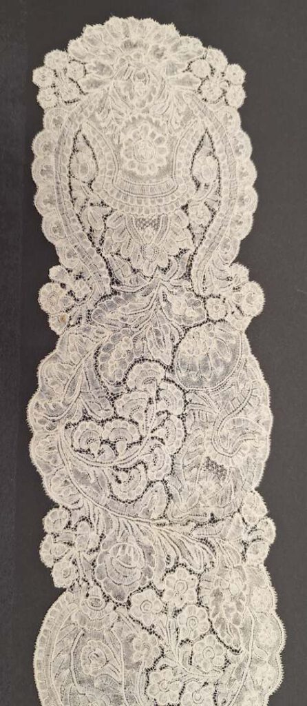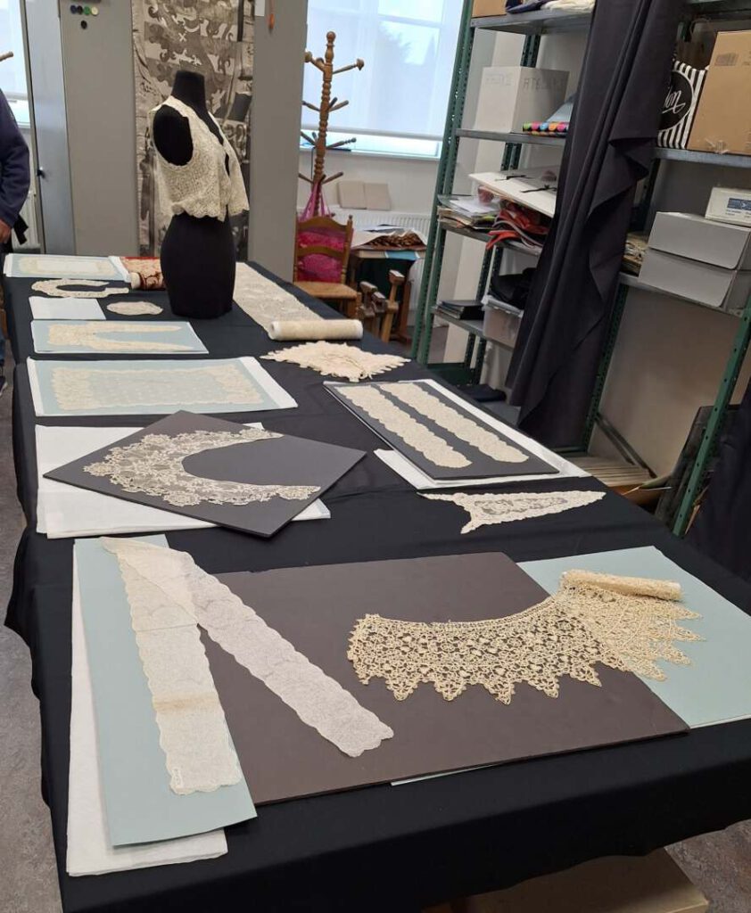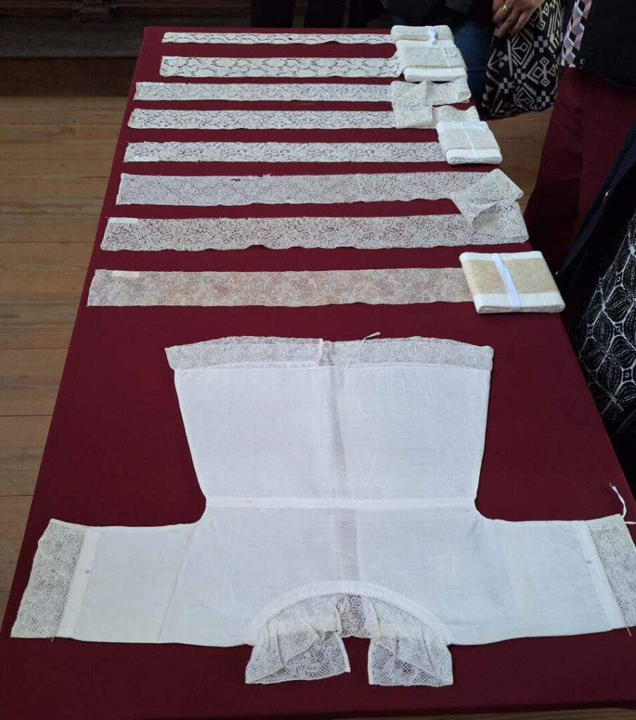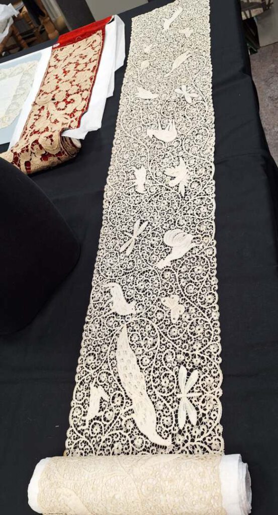 Nach Eingang aller Spitzen haben wir sie, aufgeheftet auf einer Unterlage, erstmals in unserer Ausstellung „Patchwork und Spitze – eine spannende Kombination“ im Januar 2025 präsentiert. Die Ausstellung ist noch bis zum 13. April 2025 zu sehen. Das gegengleiche Pendant des Spitzenwerks stellen wir der Handspinngilde e.V. zur Verfügung.