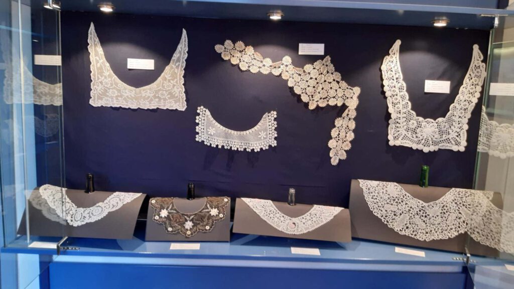Obwohl die Deutsche Spitzengilde e.V. nur ein kleiner Verein ist hatte sie doch eine außergewöhnliche Ausstellung vorbereitet, um Modetrends im zeitlichen Ablauf der Geschichte zu zeigen. Ausgestellt waren neben den historischen Kragen aus der Sammlung der Deutschen Spitzengilde e.V. auch Exponate von lebenden Entwerferinnen, deren zeitgemäße Kragenformen Ausdruck ihrer Individualität sind. Gearbeitet wurden sie in alten, zum Teil fast vergessenen textilen Techniken. Es sind Unikate, ja Kunstwerke, die diesen Namen wirklich verdienen.
