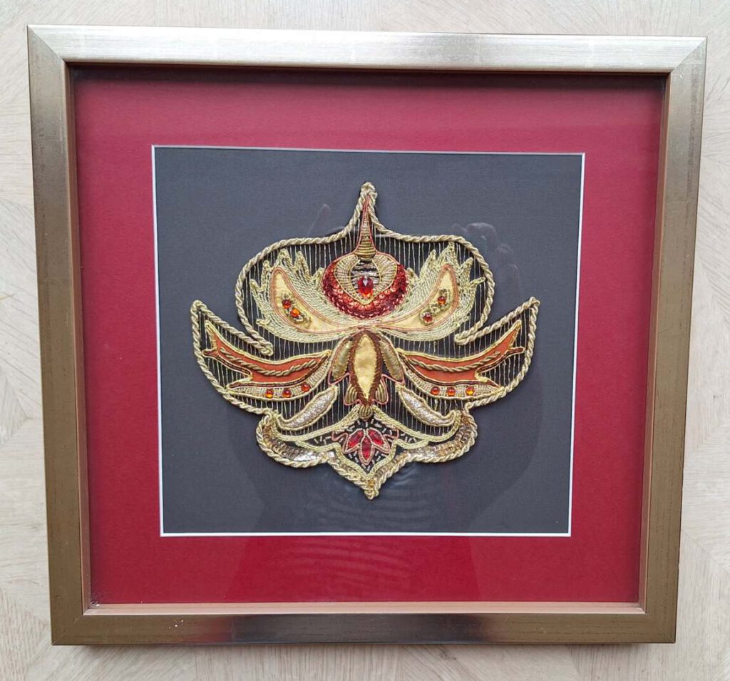 Der Goldfaden verläuft auf beiden Seiten des Gewebes, so dass das Motiv von beiden Seiten sichtbar wird.