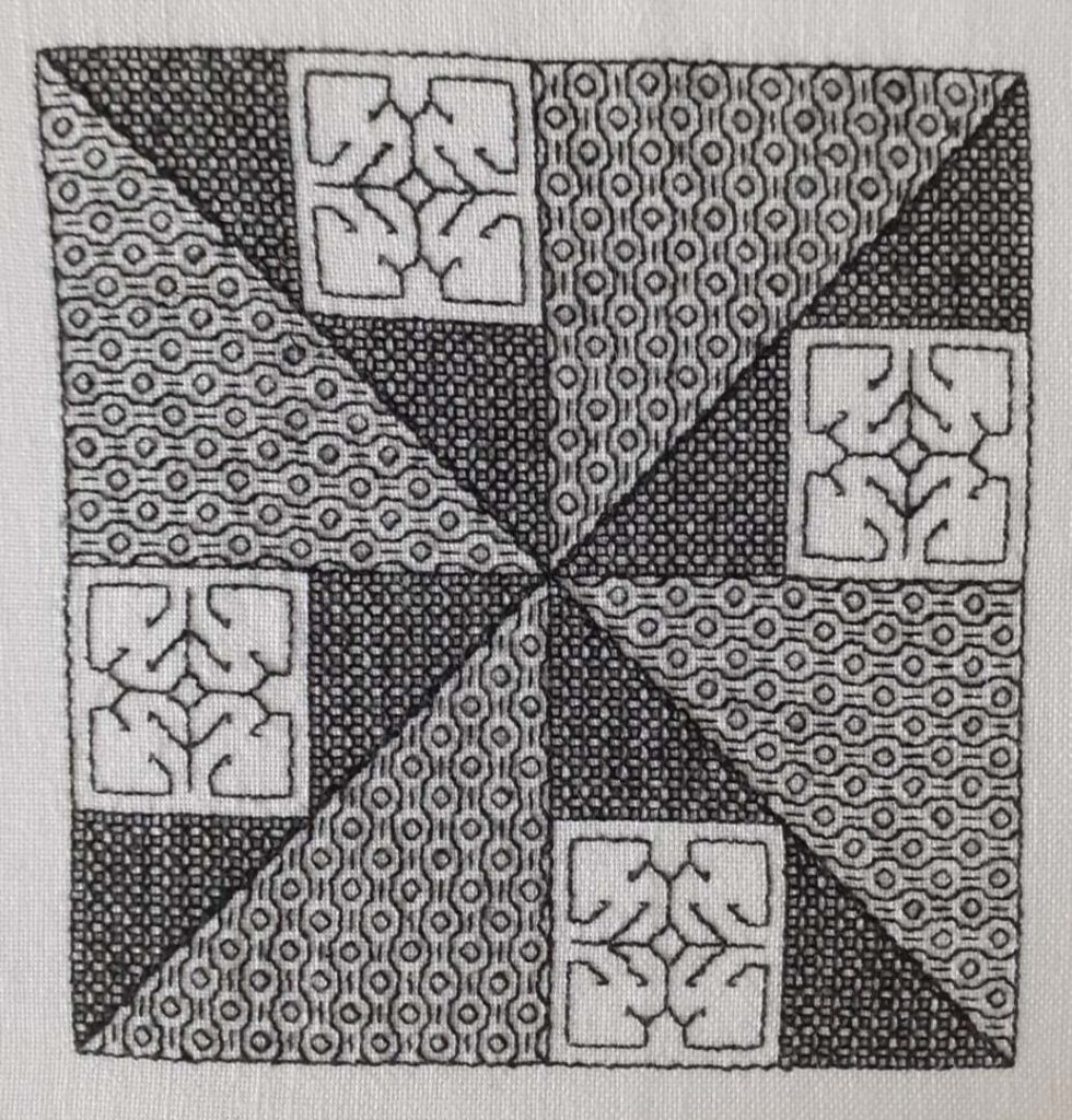 Die Schwarzstickerei/Blackwork gehört zu den nicht fadengebundenen Stickereien. Ein einfarbiger Faden (nicht zwingend schwarz) arbeitet vorwiegend den Linienstich. Durch unterschiedliche Füllmuster wird der Schattierungseffekt erzielt.