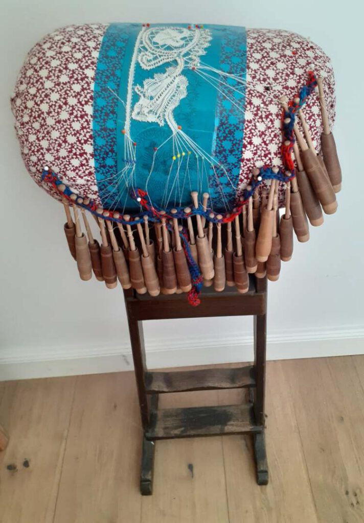Klöppel auf dem Flachkissen aus der Sammlung Maria Kilian und Klöppelrolle aus der Sammlung C.S.