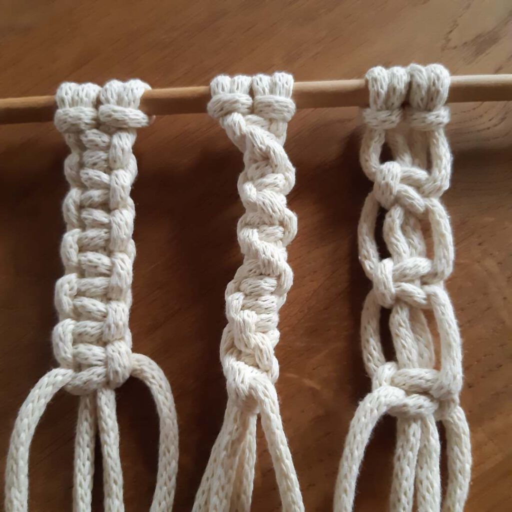 Für Makramee benötigt man folgende Werkzeuge: festes Baumwollgarn und einen Stab/Stock o. ä. zum Befestigen des Ankerknotens.